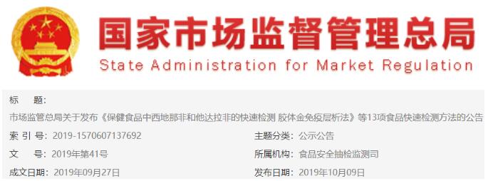 市場監(jiān)管總局關(guān)于發(fā)布《保健食品中西地那非和他達(dá)拉非的快速檢測 膠體金免疫層析法》等13項食品快速檢測方法的公告